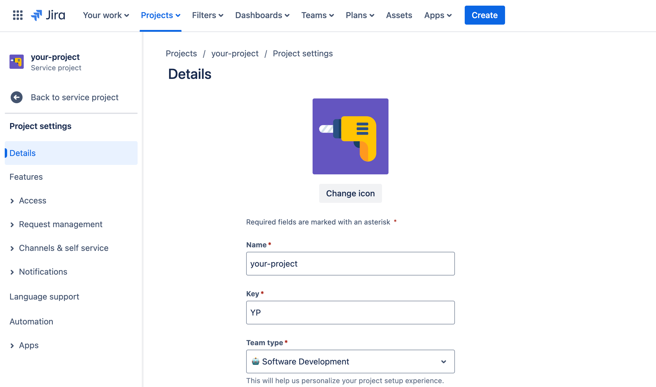 - Integration details: Name, Description, Project Key, and Request Type.